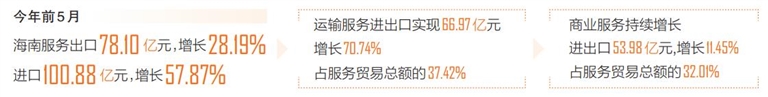 今年前5月,海南服務出口78.10億元,增長28.19%;進口100.88億元,增長57.87%。5月,全省服務貿易進出口42.47億元,增長45.02%。