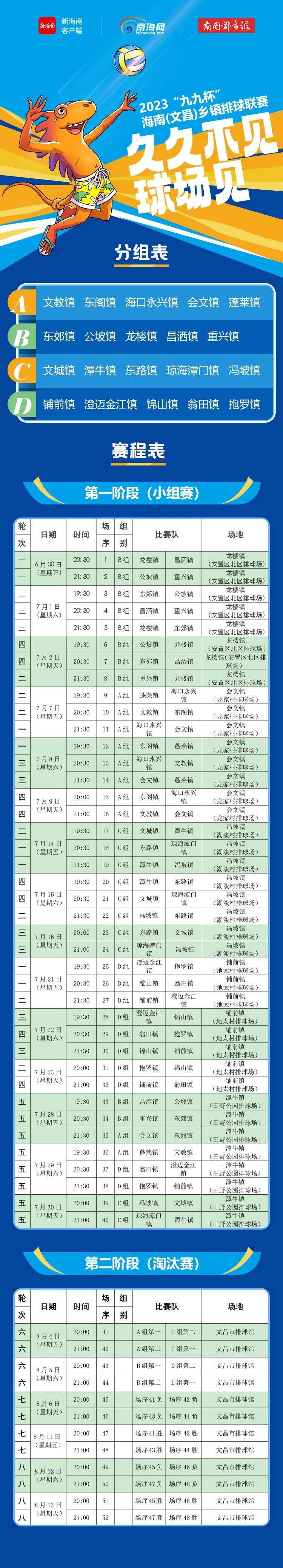 其中,文昌市17個鄉鎮代表隊以及??谑杏琅d鎮、瓊海市潭門鎮、澄邁縣金江鎮的3支鄉鎮代表隊分為四組,在第一階段40場比賽中選出各小組第一、二名,隨后8支球隊晉級第二階段淘汰賽。淘汰賽從8月4日起至8月13日每周五、六、日晚8點在文昌市排球館進行。