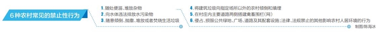 《規定(草案)》列舉了6種農村常見的禁止性行為,包括隨處便溺、堆放雜物;向水體違法排放水污染物;隨意傾倒、拋撒、堆放或者焚燒生活垃圾;將建筑垃圾向指定場所以外的農村傾倒和填埋;在村莊內主要道路兩側搭建禽畜圍欄(網);侵占、損毀公共綠地、廣場、道路及其配套設施;法律、法規禁止的其他影響農村人居環境的行為。