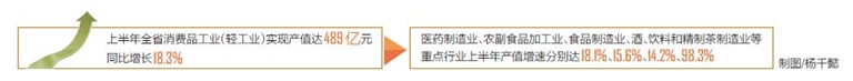 醫藥制造業、農副食品加工業、食品制造業、酒、飲料和精制茶制造業等重點行業上半年產值增速分別達18.1%、15.6%、14.2%、98.3%。