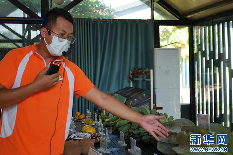 海南盛大現代農業開發有限公司推廣經理趙德勝為媒體記者講解園區內的水果。新華網發(徐淑敏 攝)