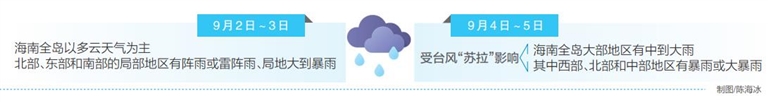 9月1日下午5時,省氣象臺繼續發布臺風四級預警,受“蘇拉”影響,9月2日下午至5日,瓊州海峽、風力6級,陣風7—9級,北部灣海面、本島西部和東部海面風力6—7級,陣風8—9級;其余各預報海區風力5—6級,陣風7—8級。4—5日,海南島有強降雨天氣。
