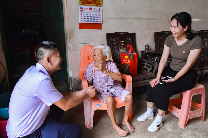 羅菁菁(右)與新任的青山村駐村第一書記一同看望村里的老黨員。新華網發