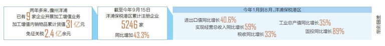 截至今年9月15日,洋浦保稅港區累計注冊企業5246家,同比增加43.3%。今年1月到8月,進出口值同比增長40.6%,實現經營總收入同比增長59%。稅收同比增長33%。工業總產值同比增長35%,固投同比增長89%。
