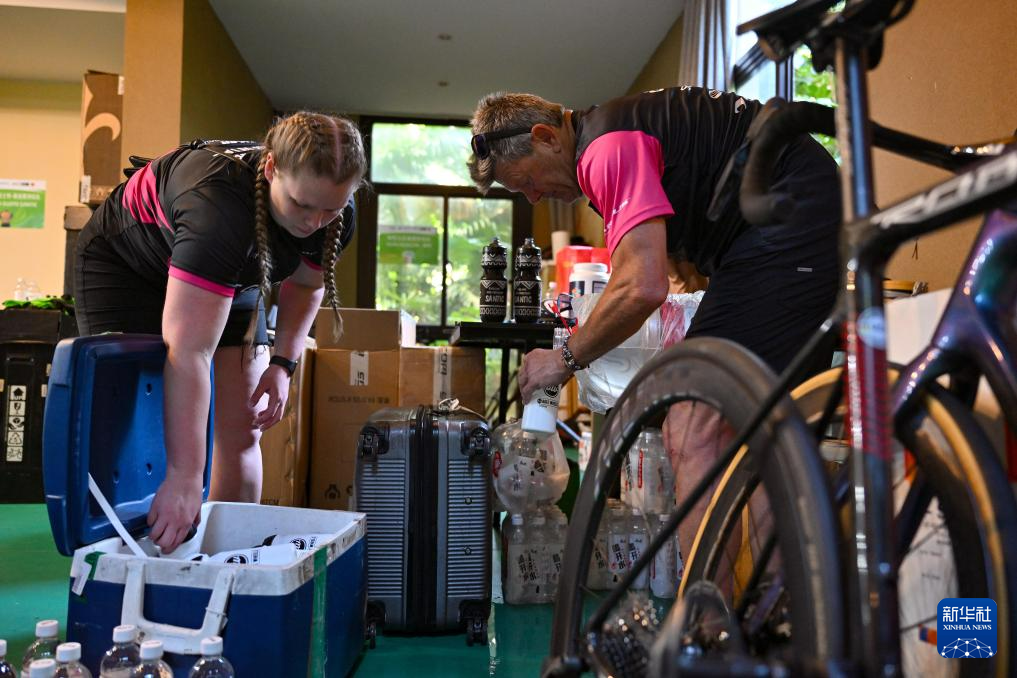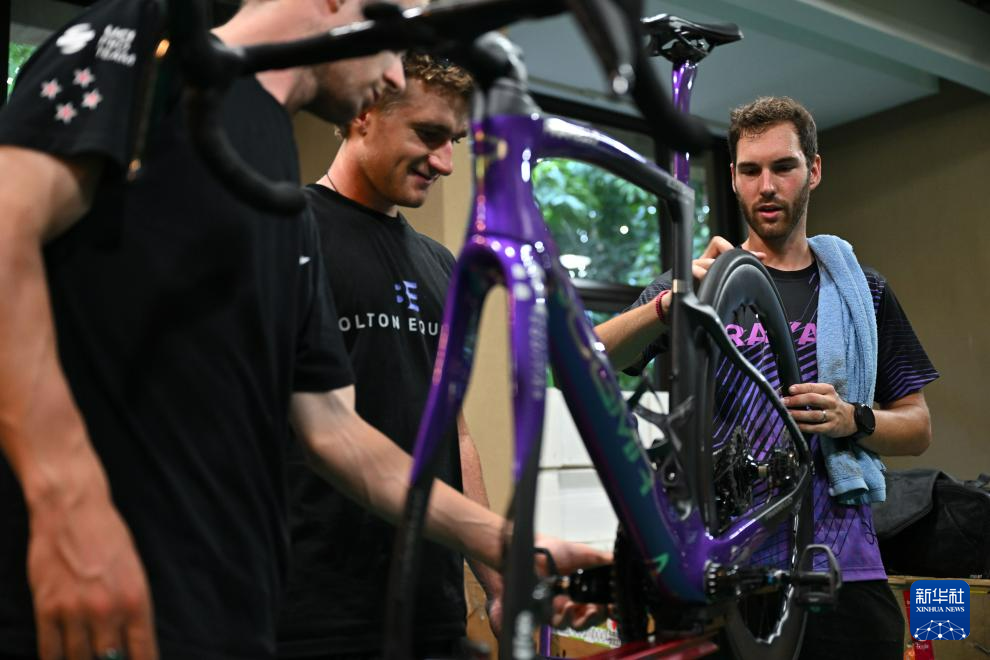 10月4日,泰國路佳線上保險車隊技師對參賽自行車進行調試。新華社記者 郭程 攝