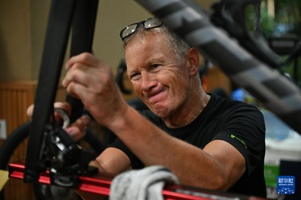 10月4日,巴迪瑞藍圖洲際隊技師對參賽自行車進行調試。新華社記者 郭程 攝