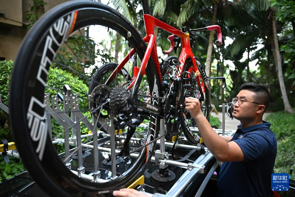 10月4日,中國國家公路自行車隊技師準備次日使用的車輛。第十四屆環海南島國際公路自行車賽將于10月5日在瓊海市開賽。新華社記者 郭程 攝