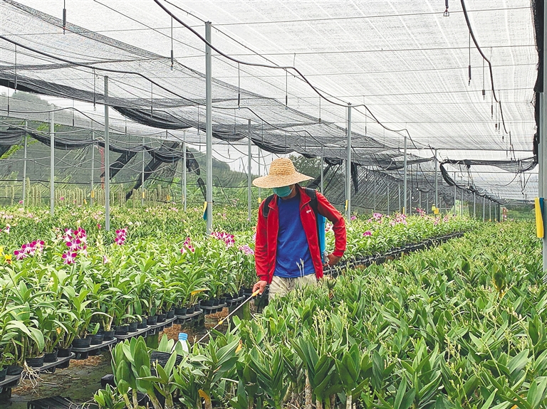 近日,在東方大田鎮樂妹村蘭花種植基地,村民文瓊潤給蘭花噴灑殺蟲劑。海南日報記者 張文君 攝
