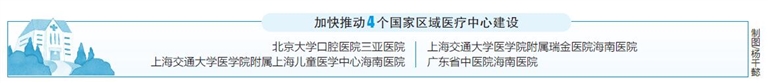 《任務》表明,將推動國家區域醫療中心和臨床醫學中心建設,加快推動北京大學口腔醫院三亞醫院、上海交通大學醫學院附屬上海兒童醫學中心海南醫院、上海交通大學醫學院附屬瑞金醫院海南醫院、廣東省中醫院海南醫院4個國家區域醫療中心項目建設,打造省級“醫學高峰”。加快推進50個省級臨床醫學中心(含中醫)建設,形成臨床重點??迫?。
