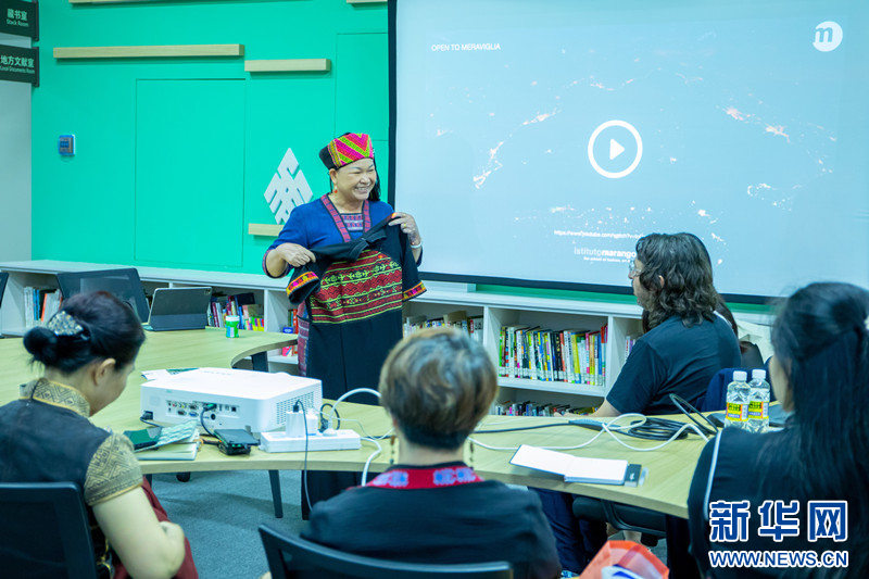 國家級非物質文化遺產黎族傳統紡染織繡技藝傳承人、“南海工匠”劉香蘭和培訓老師交流。新華網發