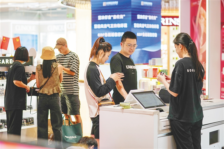 11月2日,位于??谌赵聫V場的??厝蚓访舛惓?,游客在選購免稅品。據了解,今年“雙十一”期間,??厝蚓访舛惓菍⒃诰€上線下推出多場主題營銷活動。海南日報記者 李天平 攝