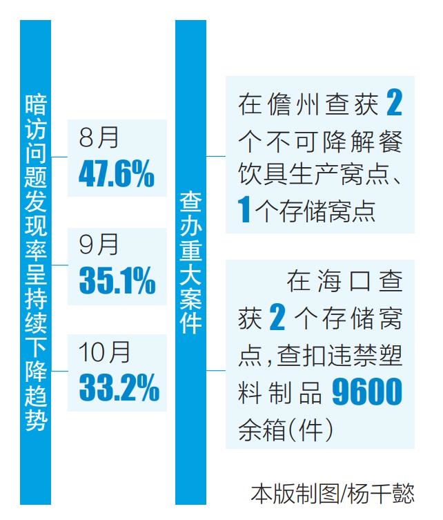 收集線索、現場核查、移交督促……在各市縣和省禁塑辦共同努力下,暗訪問題發現率呈持續下降趨勢,由8月份的47.6%、9月份的35.1%降至10月份的33.2%。
