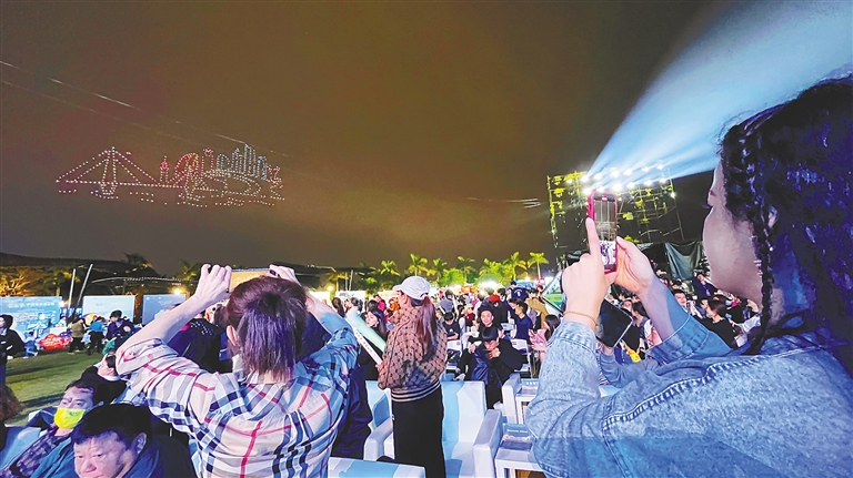 ②“歡樂海南·活力??凇睙o人機表演在??跒尘噬涎?。海南日報記者 張茂 攝