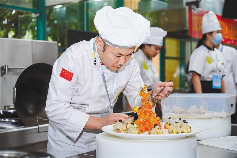 11月29日,在2023年首屆“文昌雞師傅”勞務品牌大賽上,參賽選手正在裝飾菜品。