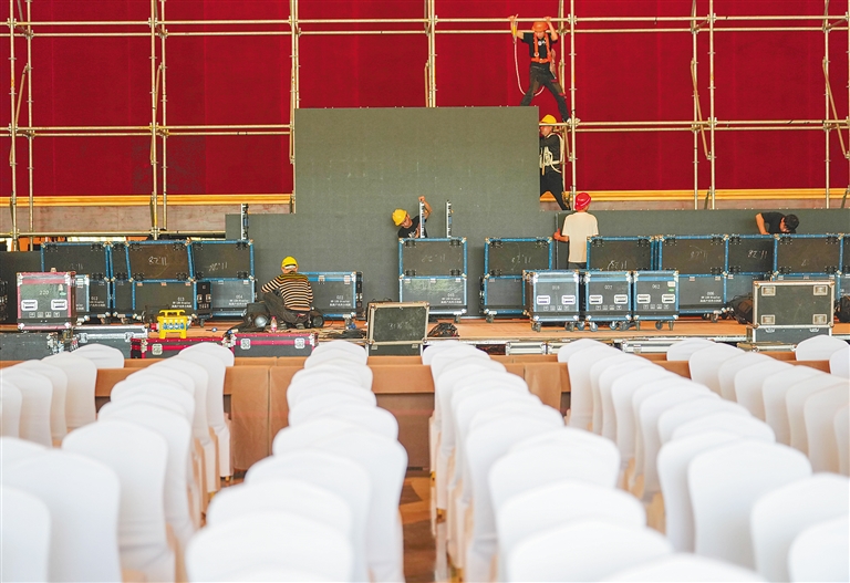 展廳內,工作人員正在擺放座椅。 海南日報記者 李天平 攝