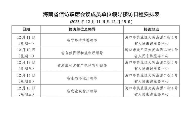 12月9日,海南省信訪局發布了省直屬單位領導12月11日至15日接訪日程。