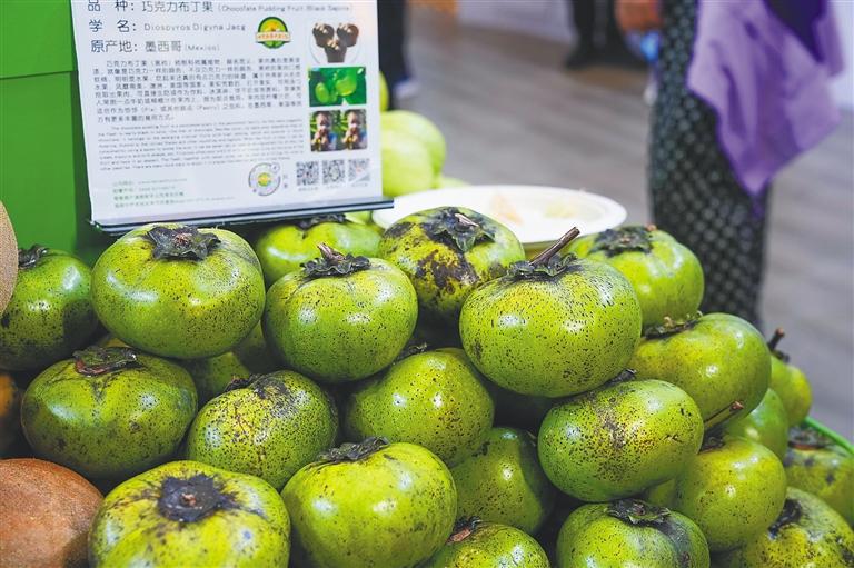 走進??陴^的??诮鹱貦盁釒е参锓N質資源科技產業園展區,太平洋橄欖、木鱉果、黃龍釋迦等來自世界各地的“新奇特優”水果琳瑯滿目。但碰到有意向購買種苗的參展商,該公司工作人員胡健芳推薦得最多的還是黃晶果。