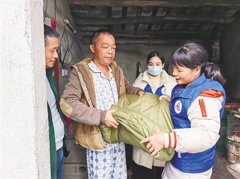 “很溫暖!”看著社工站送來的被子和大米,吳燕花連連感謝,這些御寒物資不僅暖身更暖心。