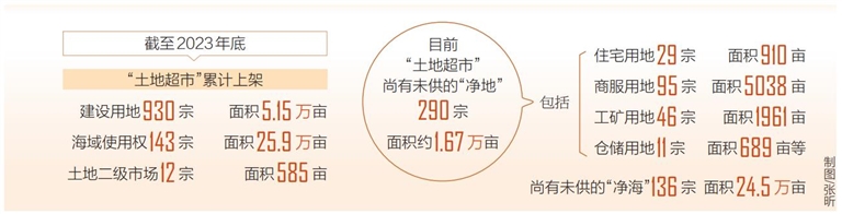 據統計,2023年全年“土地超市”全口徑收入468.87億元。截至2023年底,“土地超市”累計上架建設用地930宗、面積5.15萬畝,上架海域使用權143宗、面積25.9萬畝,上架土地二級市場12宗、面積585畝。