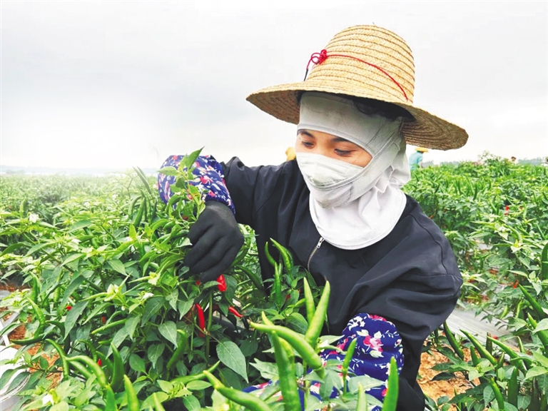 村民在王五鎮峨陽智能生態農場采摘辣椒。儋州市融媒體中心供圖