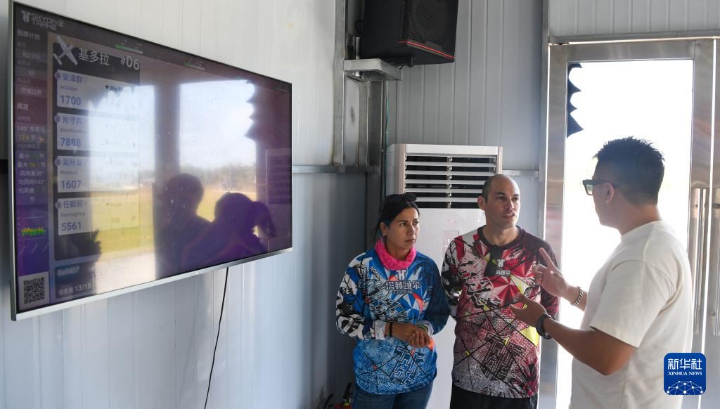 高空跳傘教練娜塔麗(左)和維克多(中)聽取張恩銘講解智能管理系統(1月9日攝)。新華社記者 楊冠宇 攝