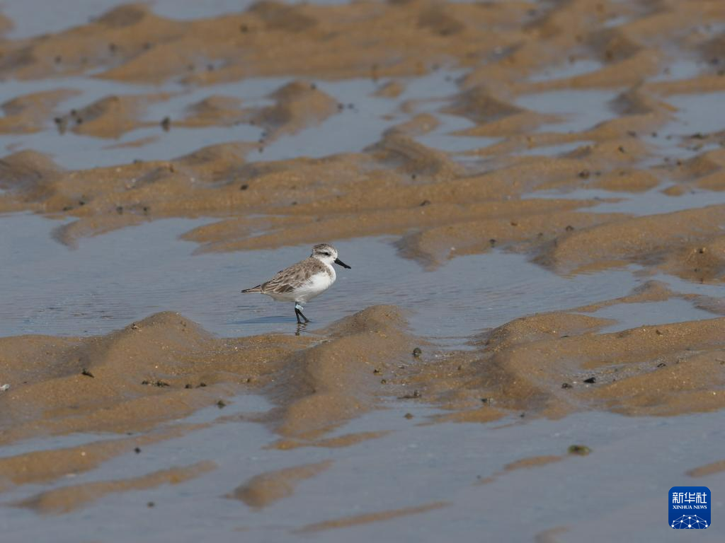 透過單筒望遠鏡,可以看到鸻鷸類鳥兒在灘涂上蹦蹦跳跳覓食,陽光灑在淺水灘上,泥沙上的貝殼閃著金光,螃蟹時不時從洞里冒出來,從鳥兒腳邊爬過。海風陣陣,鳥兒時而埋頭在水里尋找食物,時而連片飛舞,畫面十分和諧。