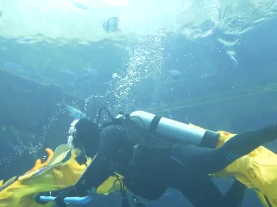 記者在三亞亞特蘭蒂斯看到,潛水員將傳統舞龍帶到水下,為游客展示別具一格的舞龍表演,以龍的形象作為新春祝福使者,展現出壯觀的海洋、流星雨、極光星空等景象,讓觀眾身臨其境地感受到山海同慶的氛圍,感受到中國傳統文化的深厚底蘊?;铎`活現的彩龍在水下游走,表演吸引不少游客紛紛駐足拍照。