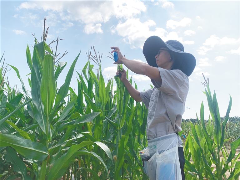 當天11時,呂玉平來到距離研發實驗室10公里外的生物育種科研基地,和其他科研人員一起為玉米進行人工授粉。烈日當空,不一會兒,他的衣服便濕透了,臉上掛滿汗珠?!拔覀冄邪l的產品得到了越來越多企業的關注,去年雜交的玉米品種有300多個,今年數量達到了900多個!”望著60畝玉米迎風成長,呂玉平古銅色的臉上露出了微笑。