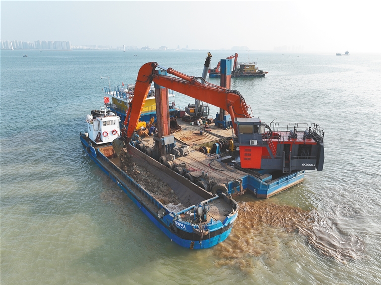 隨后,海南日報記者跟吳寶松登上一艘挖泥船,只見船頭升起長長的鐵臂,將巨大的抓斗伸入海里,不一會,抓斗抓起滿滿一斗的泥沙,隨著鐵臂轉動,抓斗被轉到旁邊的泥駁船上方,將泥沙倒在泥駁船的船艙里。