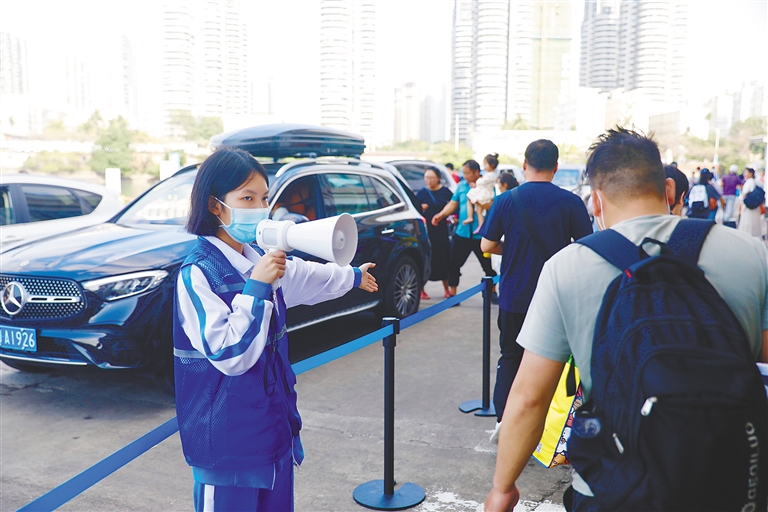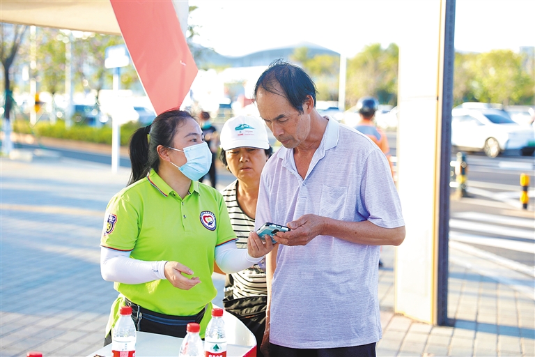 ④ 志愿者在??谛阌⒏鄯e極引導旅客。海南日報記者 韋茂金 攝