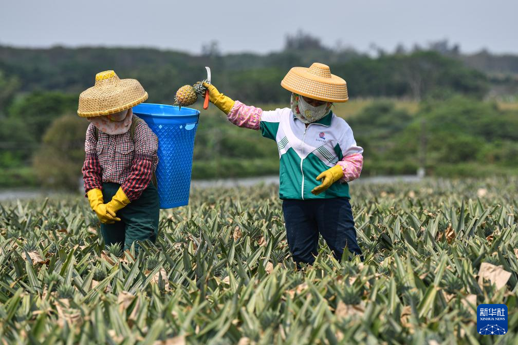 3月18日,村民在海南省文昌市錦山鎮花園村采收鳳梨。新華社記者 蒲曉旭 攝