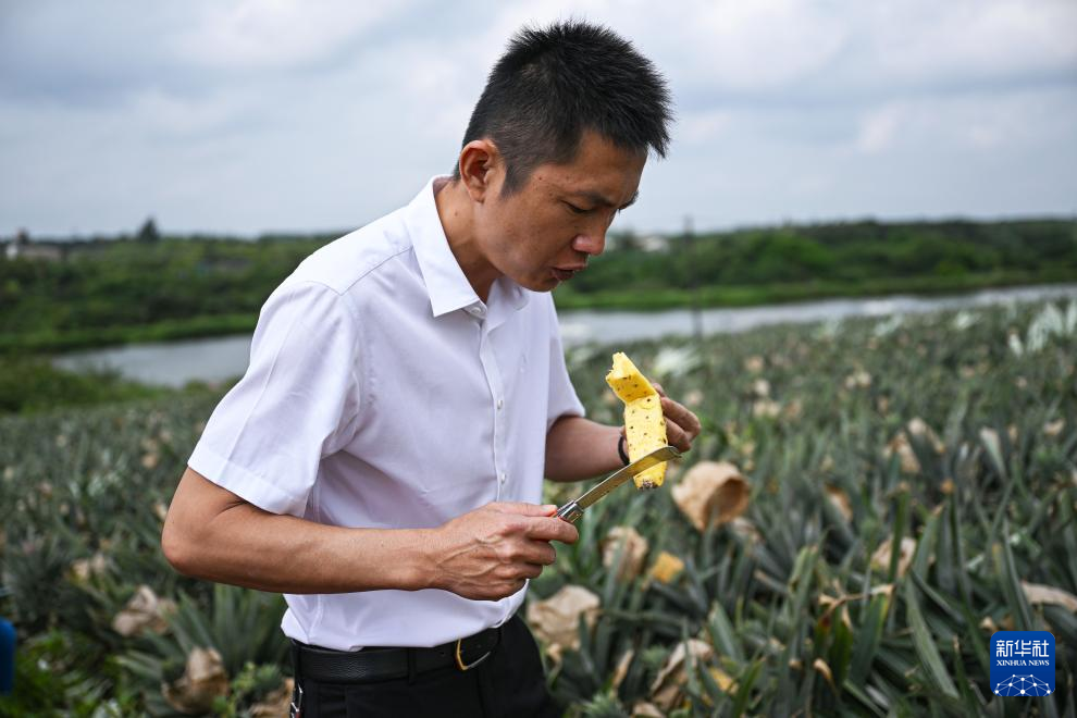 3月18日,韓衍在海南省文昌市錦山鎮花園村查驗鳳梨口味和成熟度。新華社記者 蒲曉旭 攝