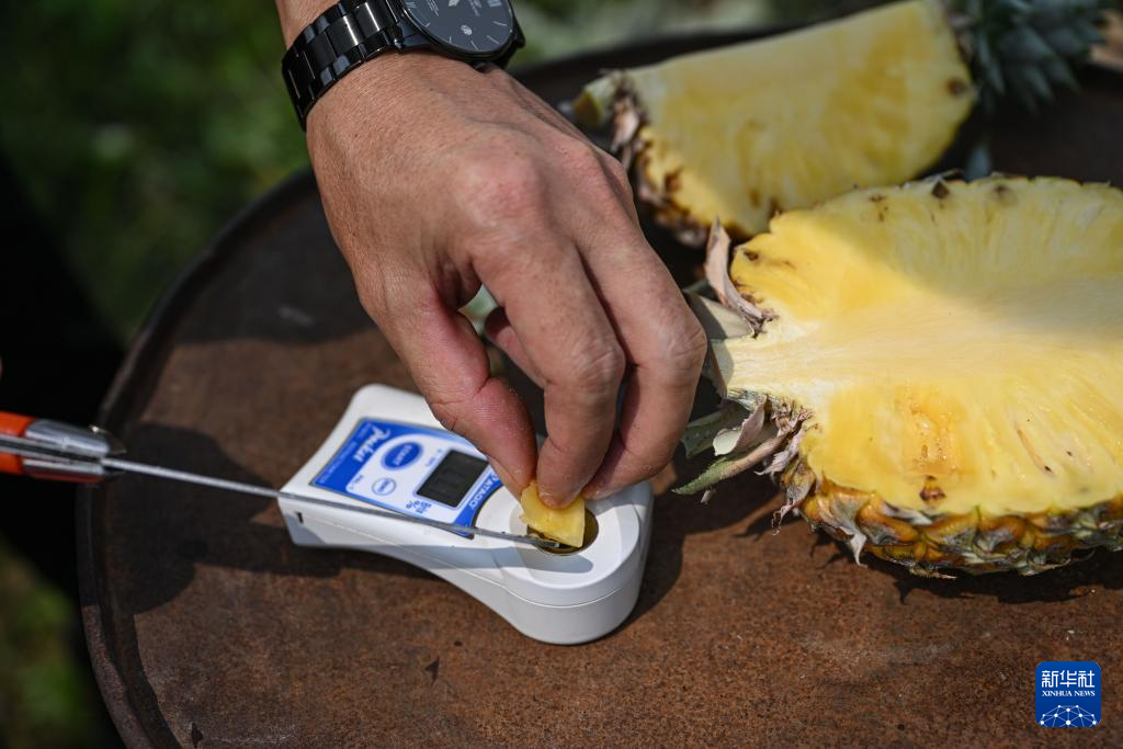 3月18日,韓衍在海南省文昌市錦山鎮花園村測試鳳梨糖度。新華社記者 蒲曉旭 攝