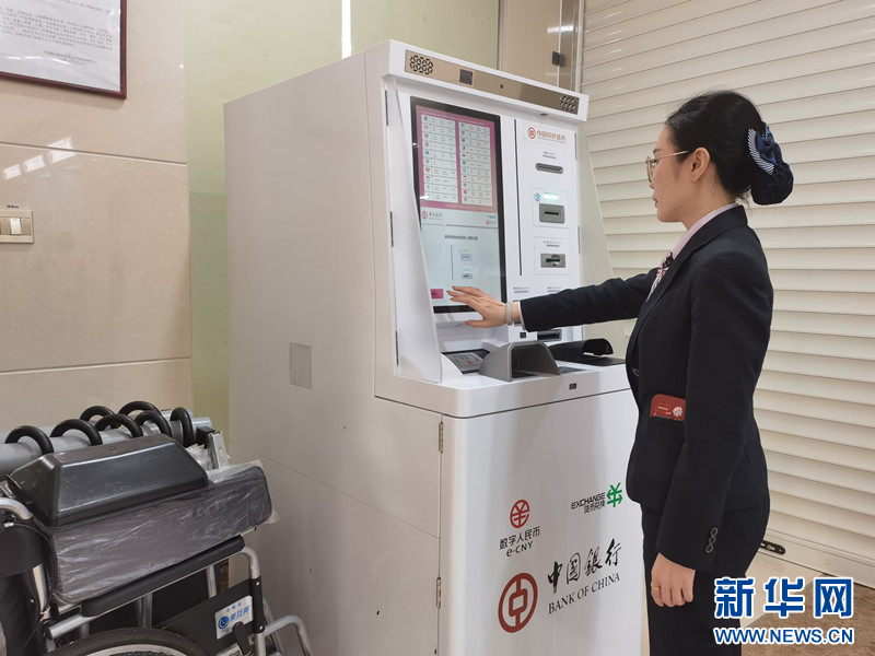 中國銀行博鰲支行工作人員演示數字人民幣外幣兌換機使用方法。新華網發