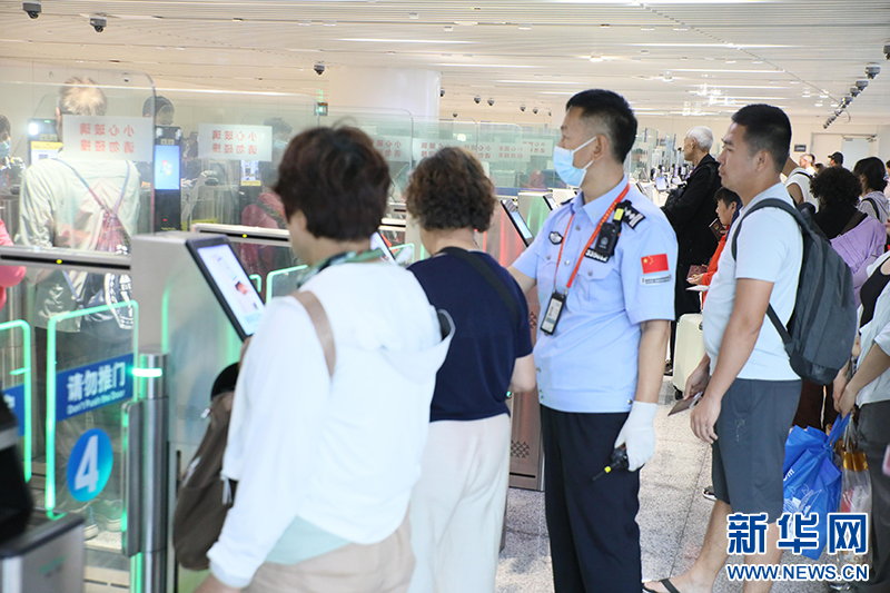 ??诿捞m邊檢站民警幫助旅客使用自助通道快捷通關入境。新華網發(李柳清 攝)