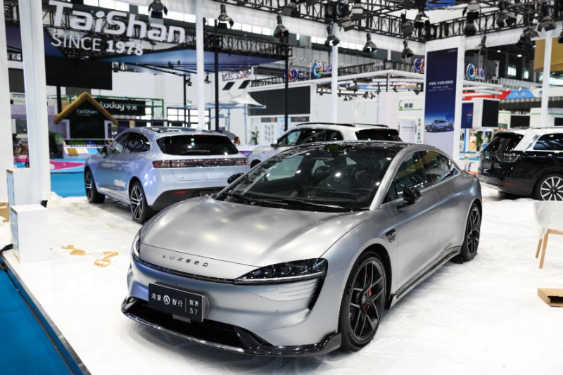 這是4月12日拍攝的第四屆中國國際消費品博覽會華為展位上的參展汽車。