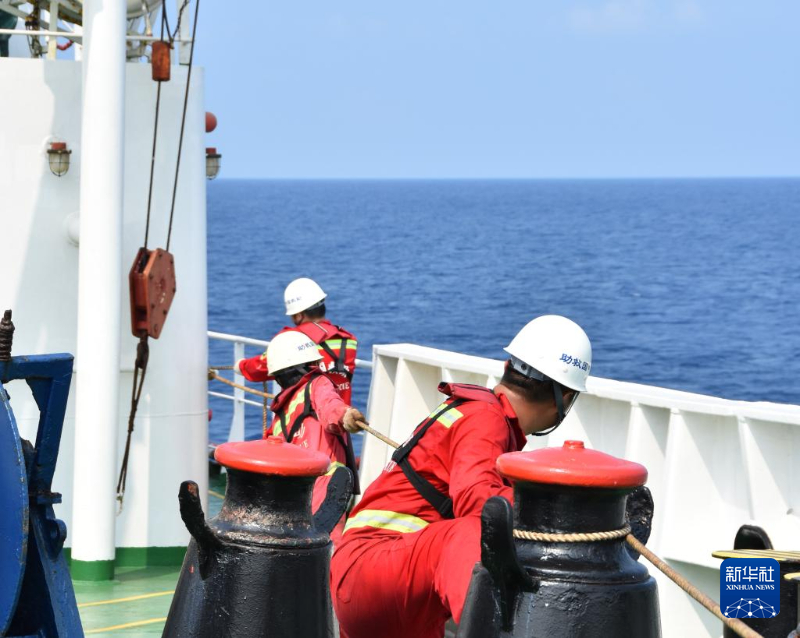 4月10日,“南海救115”輪甲板部人員正在安裝甲板安全繩,以保障極端天氣下甲板作業人員安全。新華社記者 夏天 攝