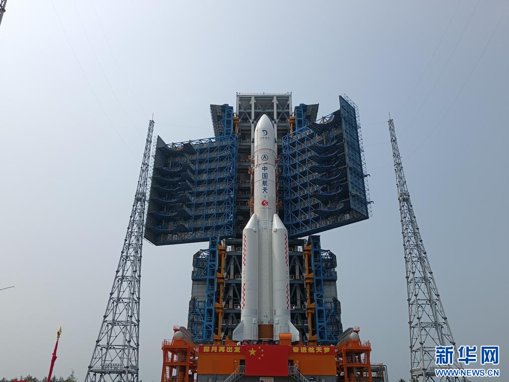4月27日,嫦娥六號探測器和長征五號遙八運載火箭器箭組合體垂直轉運至發射區。新華社發(黃國暢 攝)
