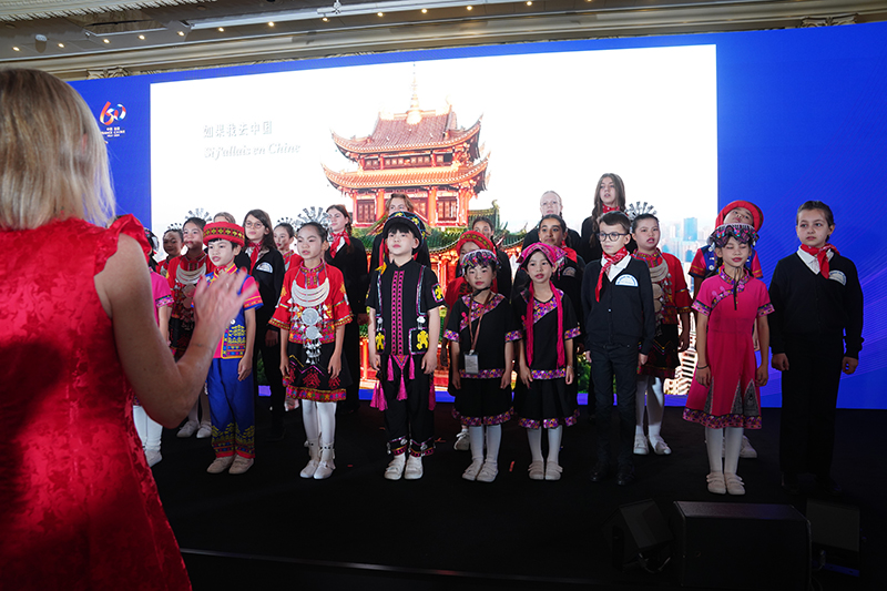 演出開始,不大的舞臺上,擠滿了兩國合唱團的成員,他們分別演唱不同國家的曲目。五指山黎苗童聲合唱團演唱的《把五指山唱給法蘭西》、黎族民歌《撿螺歌》奧運主題曲《我和你,手拉手》等歌曲,歌聲悠揚,情感真摯,深深打動了在場的每一位觀眾。華燈初上,兩國孩子們一同唱起《茉莉花》《但愿人長久》等在中國耳熟能詳的歌曲。