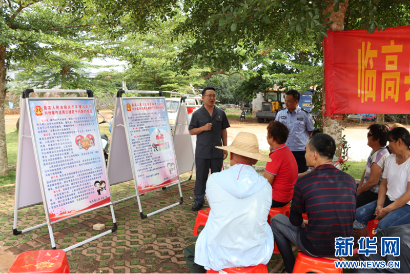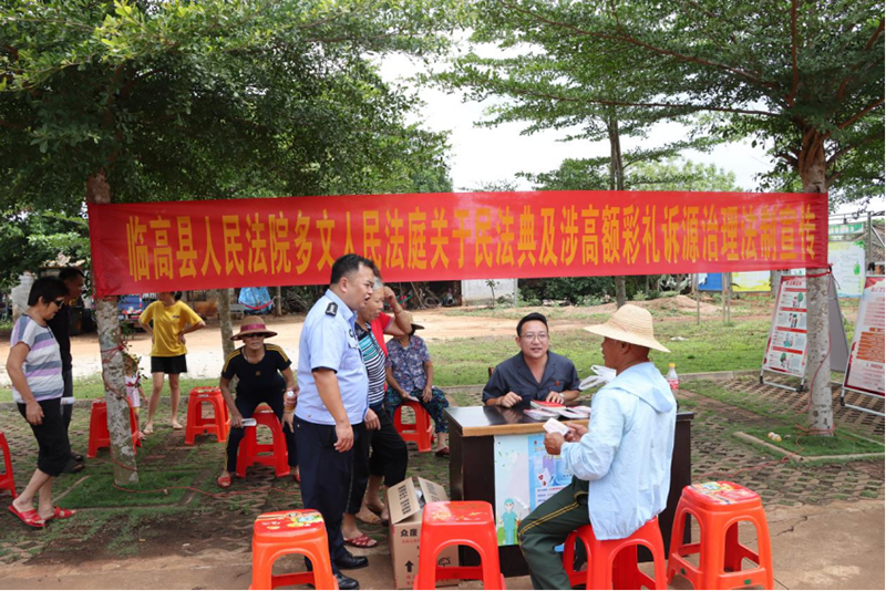臨高縣人民法院多文人民法庭干警于5月9日上午到頭神村委會開展高額彩禮訴源治理普法宣傳活動。引導廣大群眾共同抵制陳規陋習,遏制高額彩禮之風,培育婚嫁文明新風。