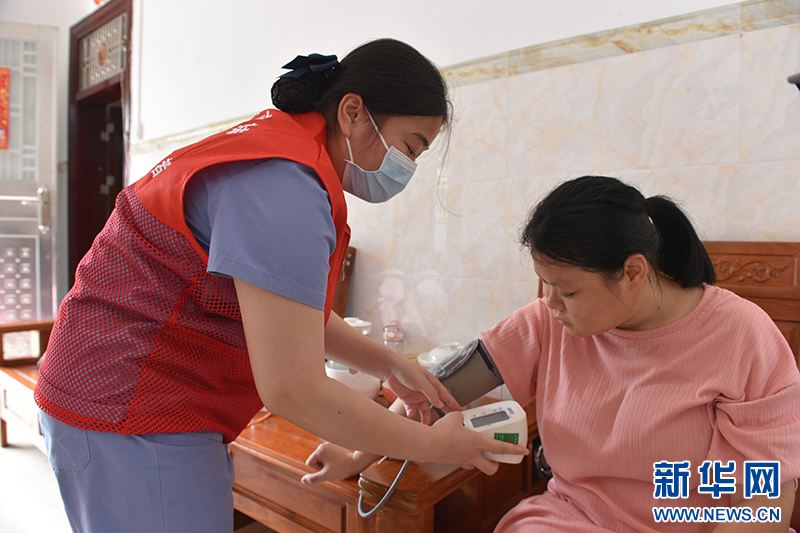 “小屯妹”志愿者龐秀菱給留守孕婦量血壓。新華網發