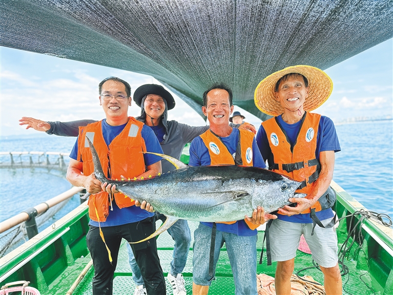 2022年,該團隊在陵水成功捕獲黃鰭金槍魚野生幼苗,并在清水灣海域馴養至今,在國內率先突破了黃鰭金槍魚網箱養殖技術。去年,隨著陵水農投和南海所開啟全面合作,雙方共同推動黃鰭金槍魚人工養殖技術落地轉化。