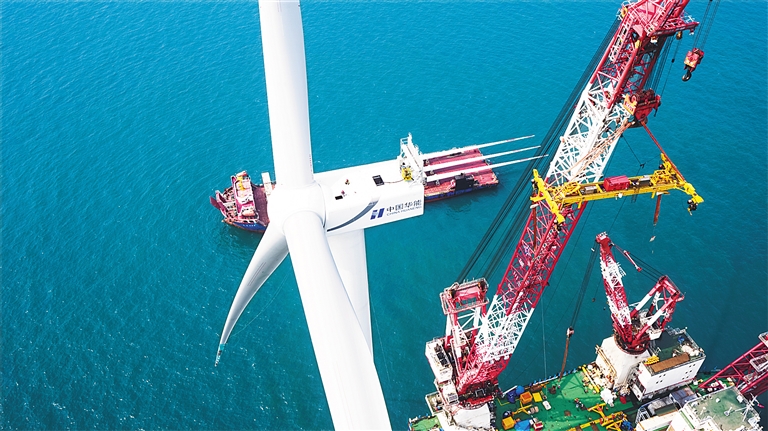 日前,航拍華能臨高海上風電場項目設備安裝現場。(臨高縣委宣傳部供圖)