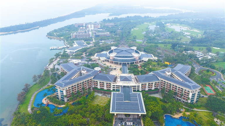 俯瞰博鰲近零碳示范區,場館屋頂被可發電的光伏板覆蓋。(資料圖)
