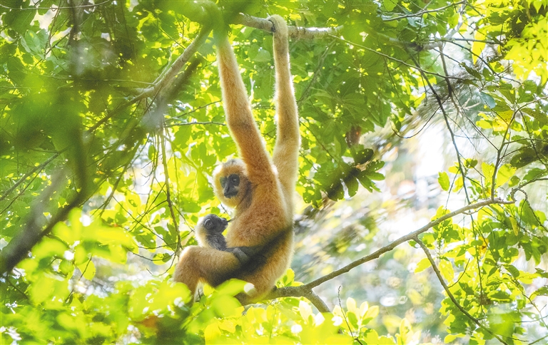 在海南熱帶雨林國家公園霸王嶺片區,海南長臂猿幼崽正在吃奶。海南日報記者 李天平 攝