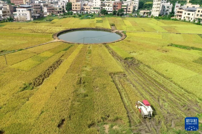 6月12日,收割機在海南省??谑虚L流鎮文毓村的稻田作業。新華社發