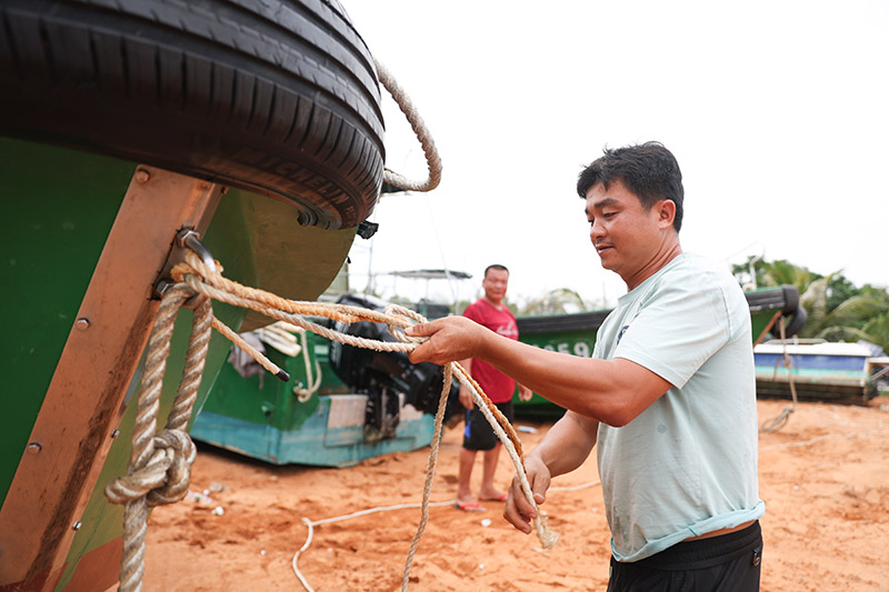明月村村民拖船上岸后對漁船進行加固。新華社記者張麗蕓 攝