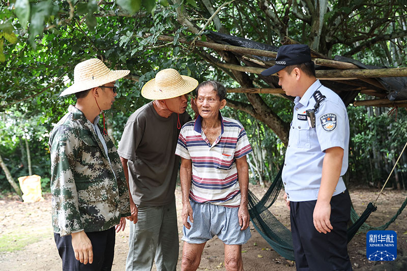 9月5日,陳卓(左一)勸說大福村一名老人轉移到集中安置點。新華社記者張麗蕓 攝