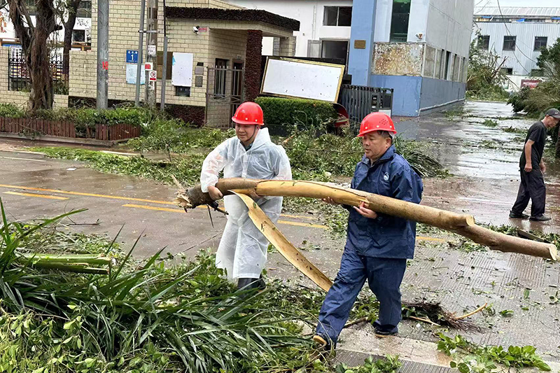 工作人員在受損園區進行道路清障和搶險救災工作。新華網發