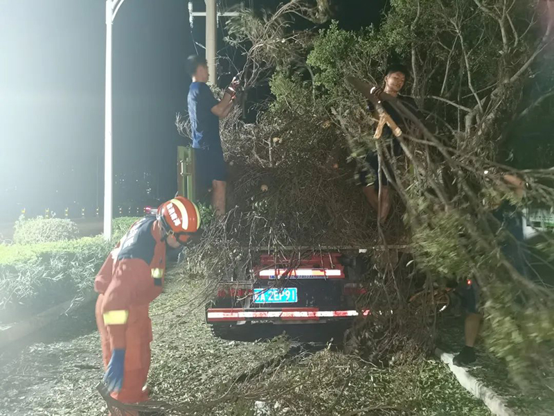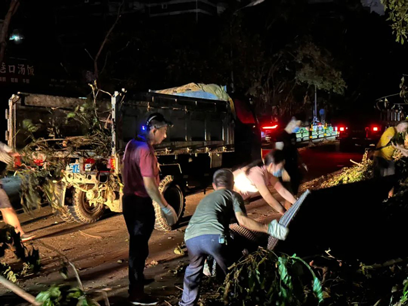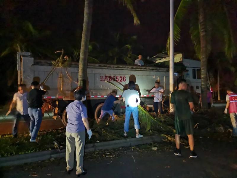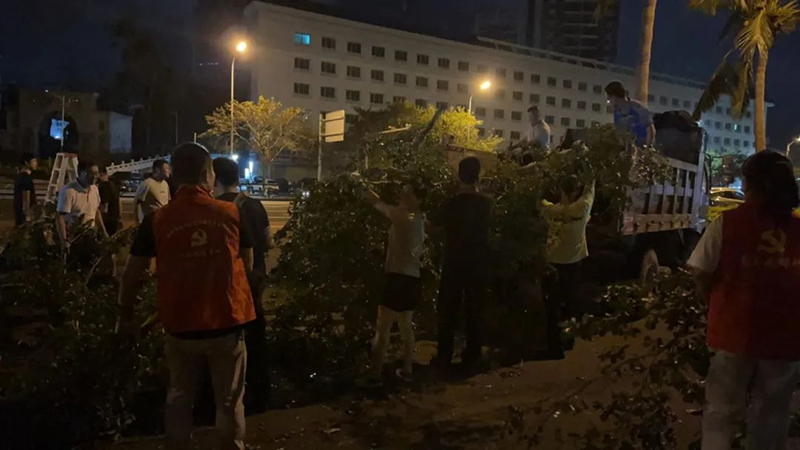 秀英區委宣傳部全體干部聯合社區干部、志愿者連夜作戰,在海秀街道愛華社區和金灘路持續清理路邊的樹干,清掃落葉,清運障礙物。